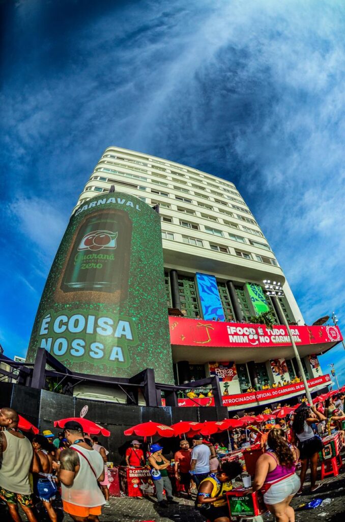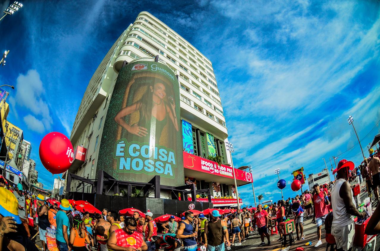 São mais de 165 metros quadrados de painéis de LED de altíssima resolução instalados em uma área de grande visibilidade do circuito Barra-Ondina. A escolha do local não foi aleatória: o Farol é vitrine global da festa, ponto de transmissão televisiva e epicentro de circulação de turistas, o que coloco os painéis sob holofote e os fez alvo de elogios.