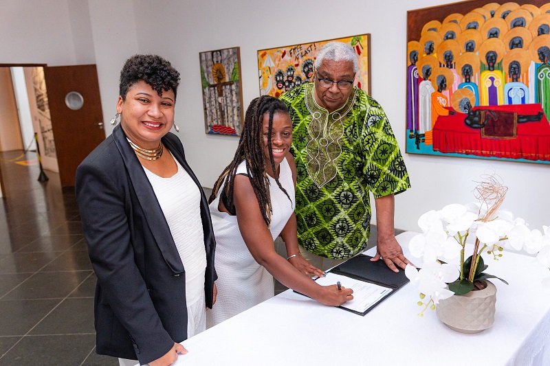 Foto: Da esquerda para a direita Cintia Maria (diretora Muncab), Ana Beatriz Almeida (curadora da exposição) e Leroi (artista doador das obras)