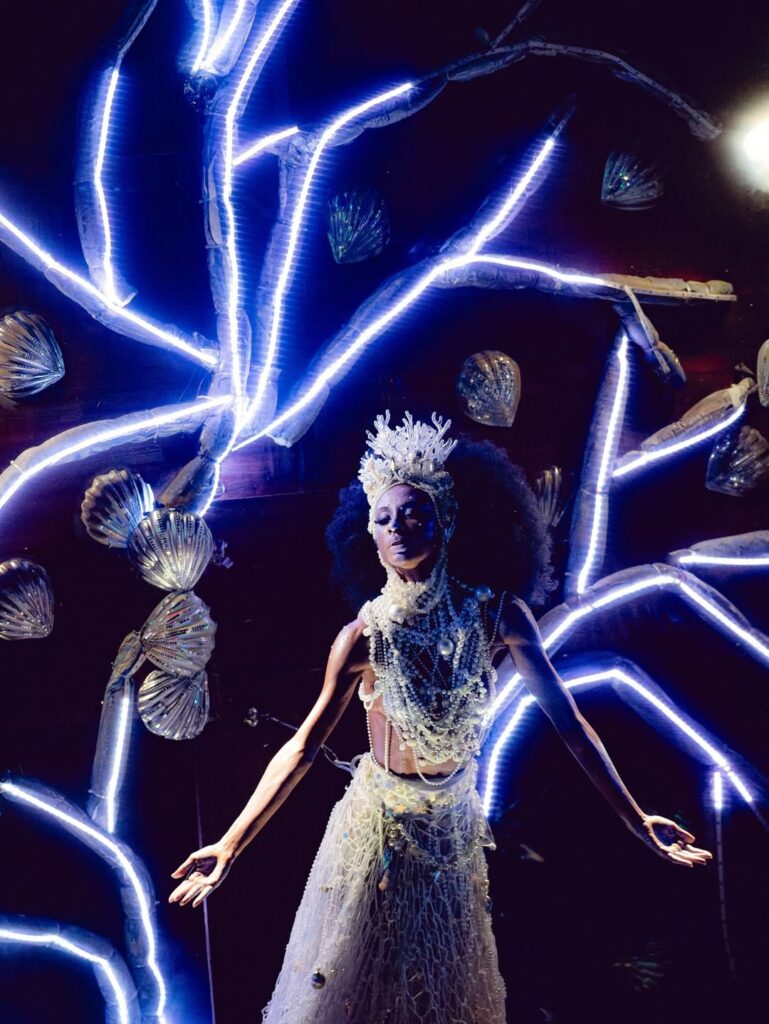 Na comissão de frente, um barco cenográfico surpreendeu ao se metamorfosear em Mãe d’Água, enquanto bailarinos encenavam pescadores em busca de sustento material e espiritual — metáfora que costurou o desfile do início ao fim.