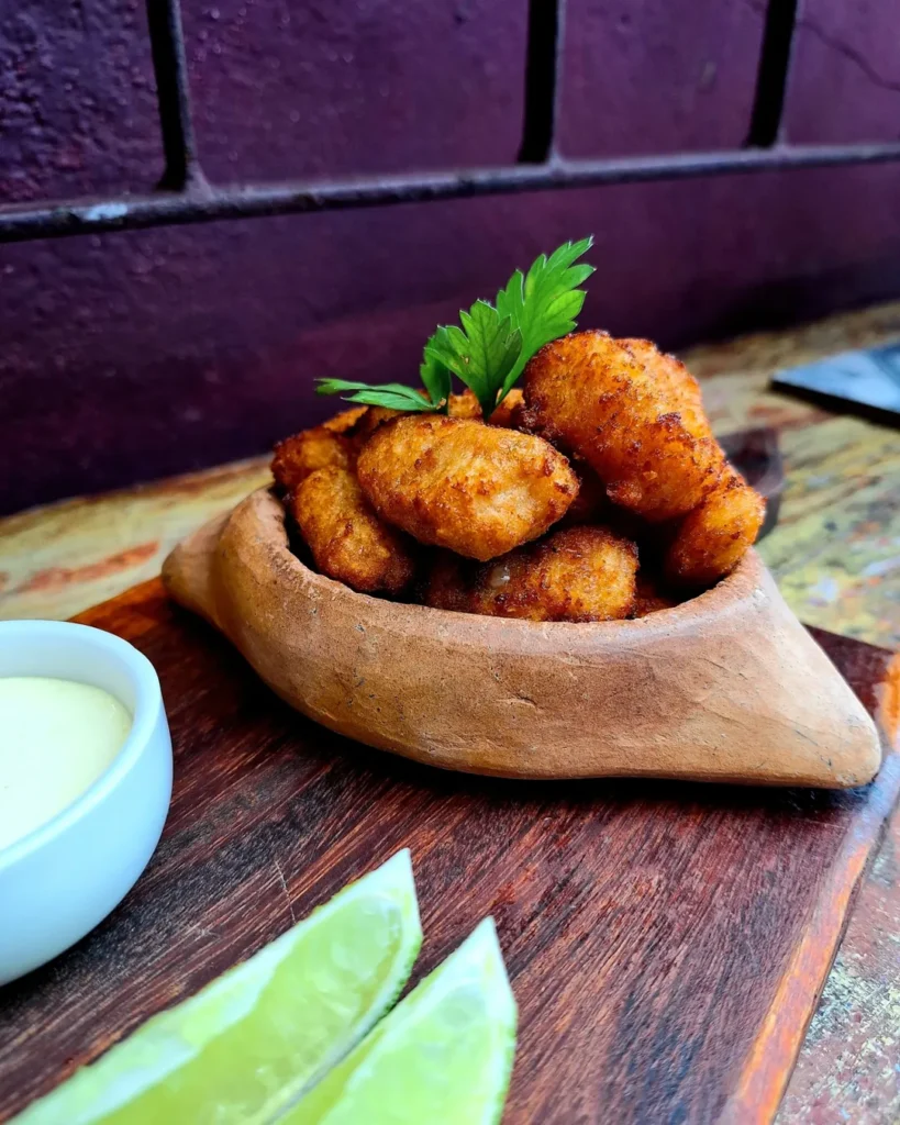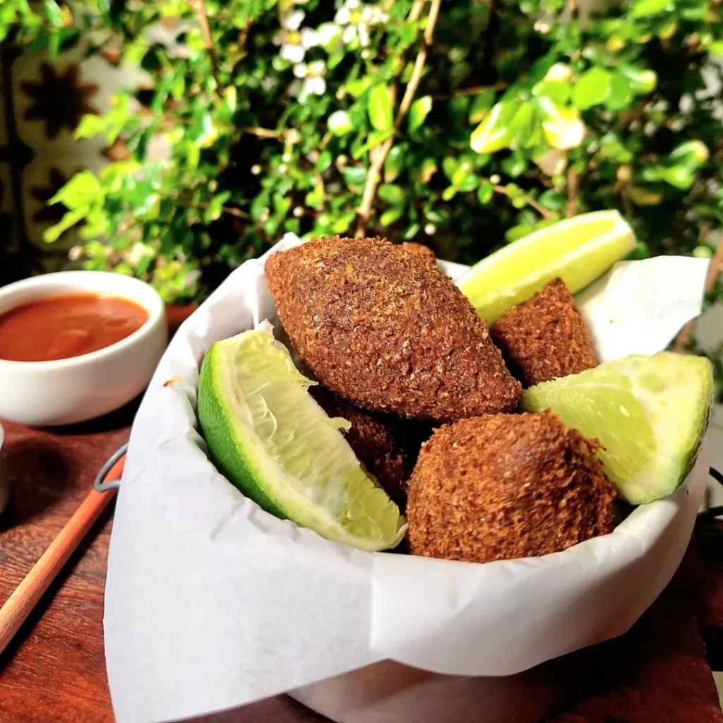 Outra opção que chama a atenção é uma entrada de nome bem humorado: o “Alibabaiano”. Inspirado no kibe tradicional, o petisco aparece em uma versão direta, sem excessos. A casca crocante contrasta com o recheio bem temperado, e os acompanhamentos — molho de pimenta e ketchup de goiaba — criam um jogo interessante entre o salgado e o adocicado. Funciona como uma releitura simples, mas eficiente, de um clássico.