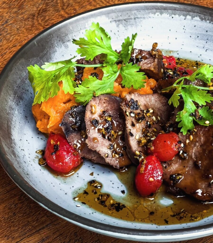 Algumas escolhas fogem do óbvio — e é justamente aí que o cardápio encontra um de seus pontos mais interessantes. A “Dona Fifi” é um exemplo claro disso. A língua, cozida no vinho tinto e envolvida em um demiglace, aparece macia e cheia de sabor, desmanchando com facilidade. Acompanha um purê romesco e uma salada vinagrete com croutons e parmesão. Pouco comum em muitos cardápios, a opção pode causar estranhamento inicial, mas rapidamente se revela uma escolha acertada.