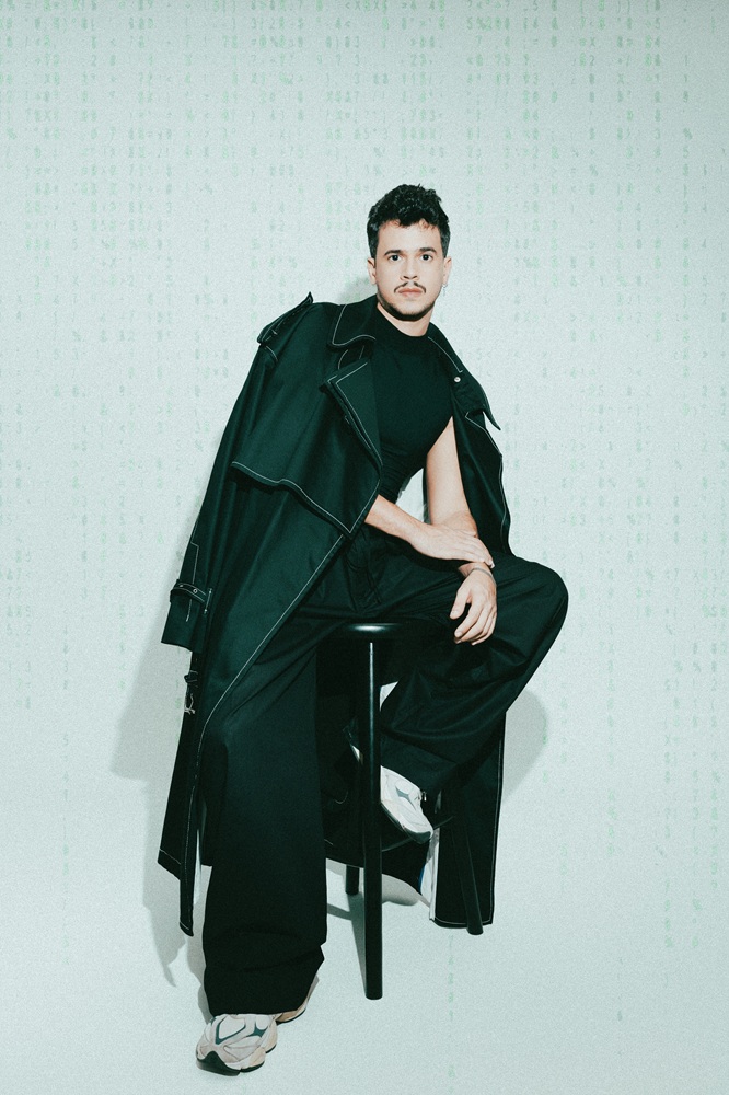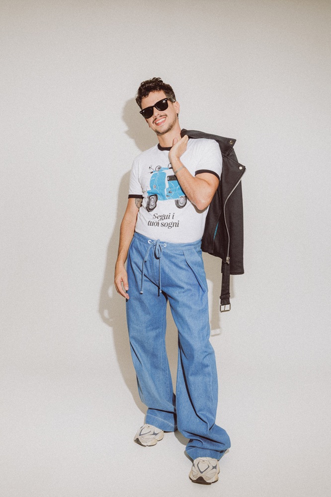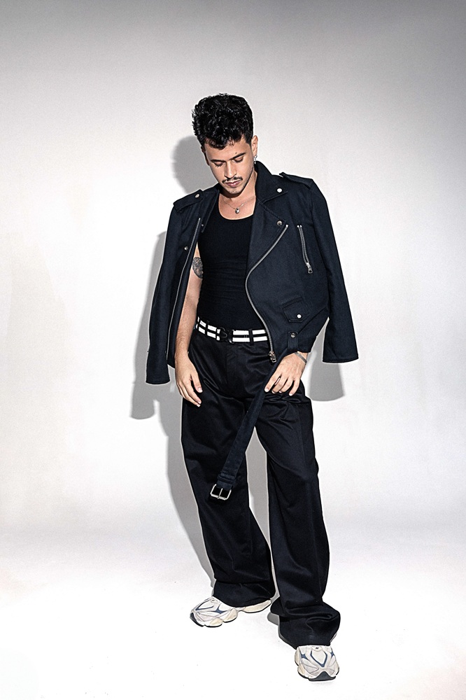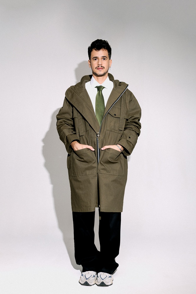 Ao incorporar diferentes arquétipos das telonas, Lelis dá vida às composições pensadas por Vila Nova e Bispo, que combinam peças clássicas do guarda-roupa masculino — como parkas, jaquetas de couro, camisetas gráficas, trench coats e jeans — com elementos de alfaiataria moderna. O resultado é uma leitura sofisticada e urbana da estética cinematográfica usando peças das nova coleção do estilista baiano, Amore.