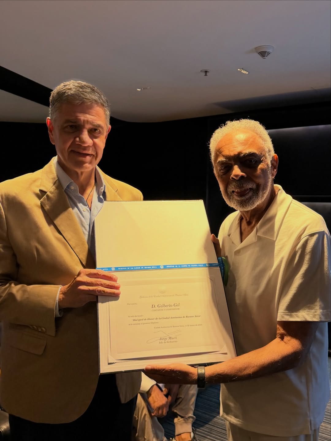 “É o reconhecimento que você merece”, disse Macri para Gil, que respondeu: “É uma honra, [recebo] com carinho e com amor”. Outros nomes de peso que o músico encontrou no evento foi Charly García, considerado um dos principais nomes da história do rock na Argentina e Rubén Rada, uma das figuras mais influentes da música popular uruguaia.