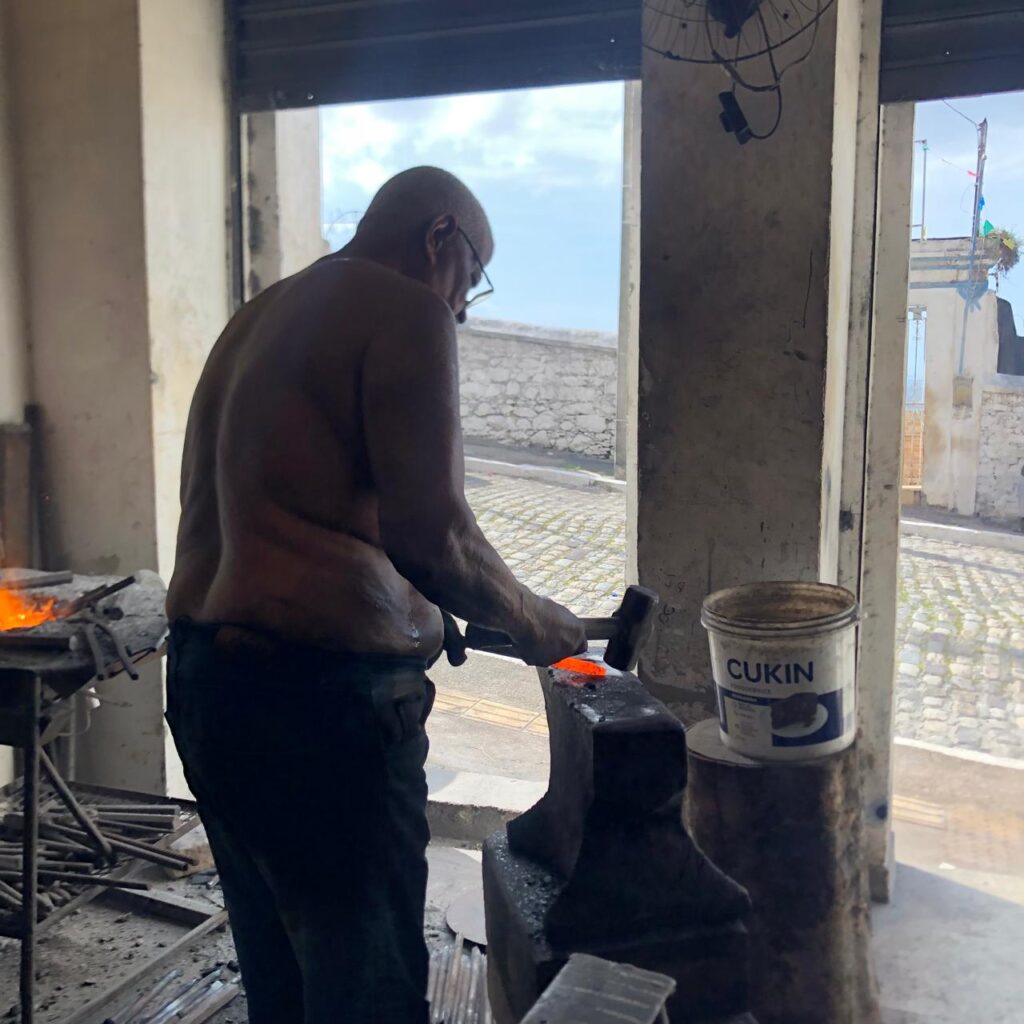“Quando você quer uma coisa de ferro ou mármore que exige um certo zelo e um certo manuseio, você só encontra na Ladeira da Conceição. Quando quer arte ou algo dificultoso, você vem aqui, porque qualquer artífice daqui tem capacidade de fazer essas coisas. A tecnologia veio para avançar, mas ela não recupera nada”, afirma Edmilson Rodrigues, 74, outro ferreiro que é filho da Ladeira. Entre uma martelada e o derretimento do ferro para o molde, o artífice explica a resistência da ladeira, que é referência nos seus serviços.