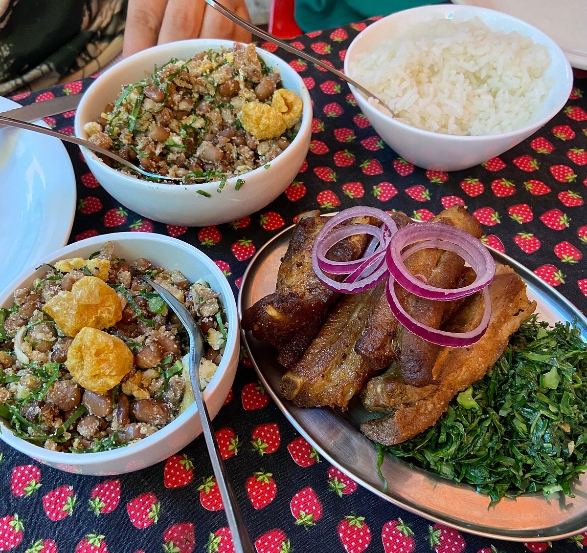 Outro clássico que merece atenção é o tutu à mineira. O feijão, flambado na cachaça, ganha profundidade de sabor e um aroma sutil que se integra ao prato. Acompanhado de costelinha suína frita, crocante na medida, e arroz, forma uma combinação que traduz bem a essência da cozinha mineira: robusta, acolhedora e direta.