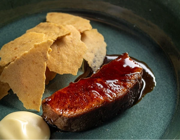 Carne do sol com mousseline de abóbora defumada, aspargos e crispy de cebola