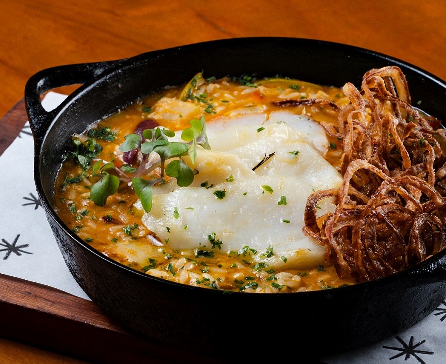 Nem toda mesa precisa surpreender. Algumas precisam apenas funcionar bem. Em A Taberna, no Horto Florestal — o bacalhau aparece em estado de conforto máximo como Arroz Meloso. Cremoso, intenso, cheio de camadas — pimentões, azeitonas azapa, páprica defumada, parmesão e crispy de cebola. É o tipo de prato que não pede análise. Pede repetição.
