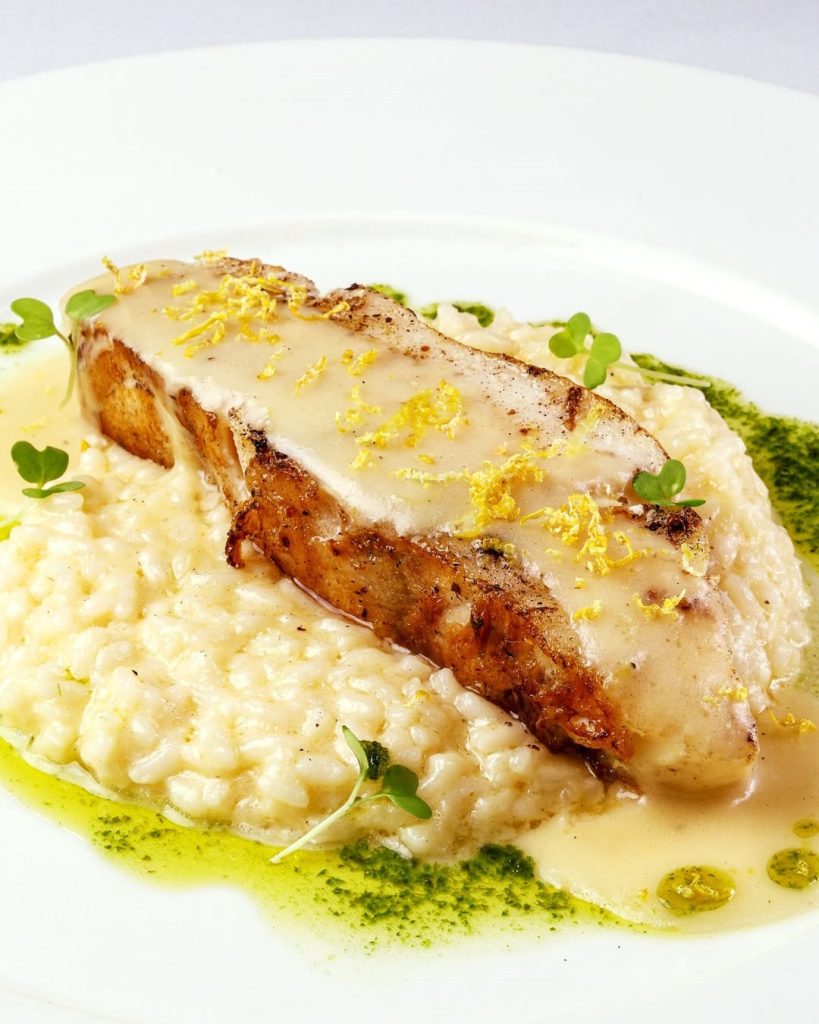 Filé de pescada amarela grelhado ao molho chardonnay. Acompanha risoto de limão siciliano (Chez Bernard).