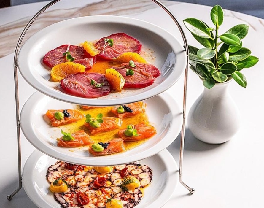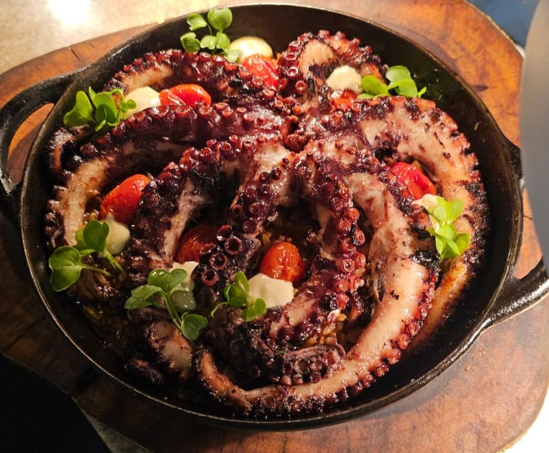 Comecei pedindo o Mezze, aquela seleção de pequenos pratos servidos como aperitivos ou entradas, comuns na Grécia, Turquia e em outros países banhados pelo Mar Mediterrâneo. E qual não foi minha boa surpresa é que a torre formada pelos pratos veio com três opções de carpaccio, sendo que apenas o de polvo compunha a versão anterior. Os dois outros foram o de camarão – bem saboroso – e o de hadoque, aquele peixe marinho das águas marinhas do Atlântico Norte – pouco difundido pelas bandas de cá – que ficou ainda mais espetacular depois de passar um ligeiro processo de defumação.