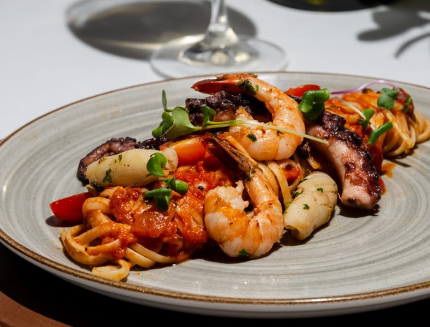 Depois veio uma deliciosa porção de bolinhos crocantes com recheio de queijo de cabra e, na sequência, uma croqueta de siri com camarão, que estava oquei e que não me empolgou muito a ponto de comer mais de uma, o que foi providencial para a surpresa que chegaria à mesa: o fritto misto di mare, uma das entradas que mais aprecio na vida. A de lá, que tem camarão, siri-mole, lula e peixe, empanados e fritos, é sequinha e muito, muito saborosa.