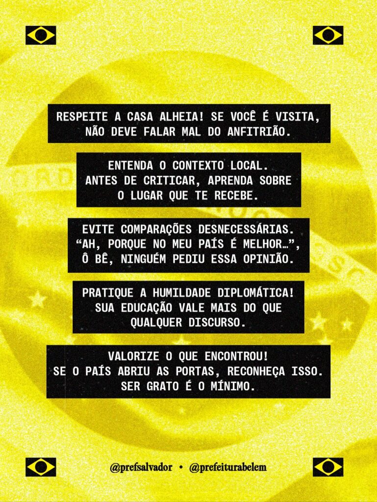 “Respeite a casa alheia! Se você é visita, não deve falar mal do anfitrião. Entenda o contexto local. Antes de criticar, aprenda sobre o lugar que te recebe. Evite comparações desnecessárias”, declararam na publicação. “‘Ah, porque no meu país é melhor…’, ô bê, ninguém pediu essa opinião. Pratique a humildade diplomática! Sua educação vale mais do que qualquer discurso. Valorize o que encontrou! Se o país abriu as portas, reconheça isso. Ser grato é o mínimo.”, completaram.